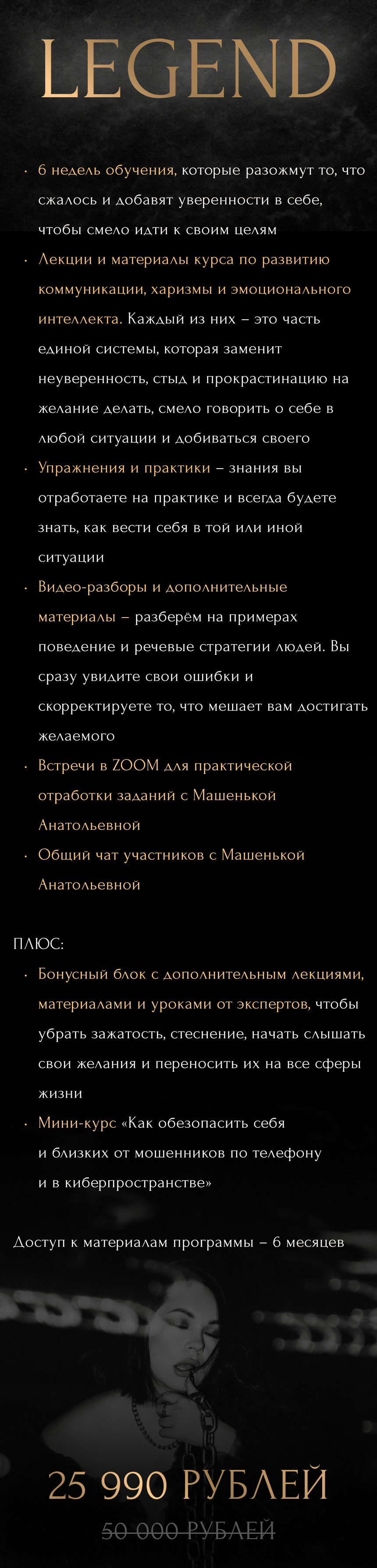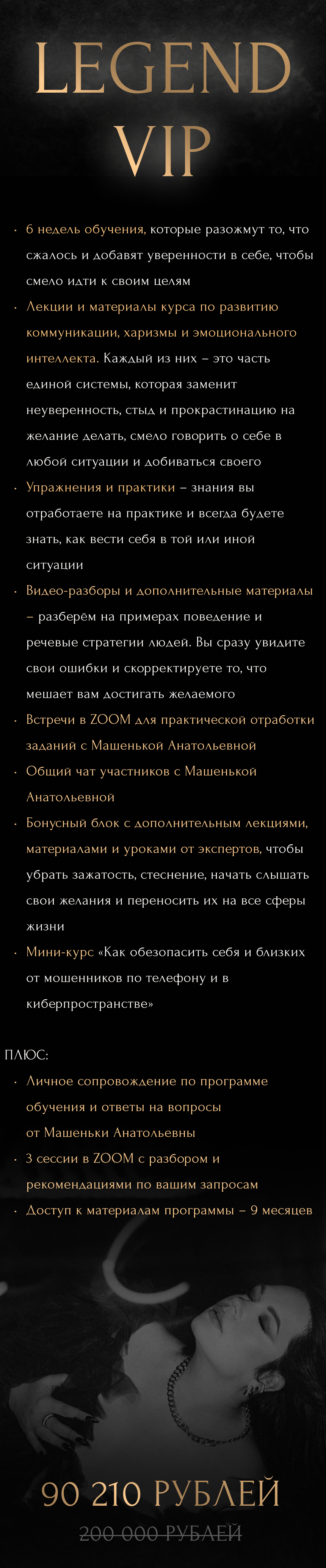 Ваш результат: уберёте страх делать и говорить о себе, выстроите режим работы и отдыха, соберёте вокруг себя людей, которые хотят за вами хотят идти, потому что вы – это вы.