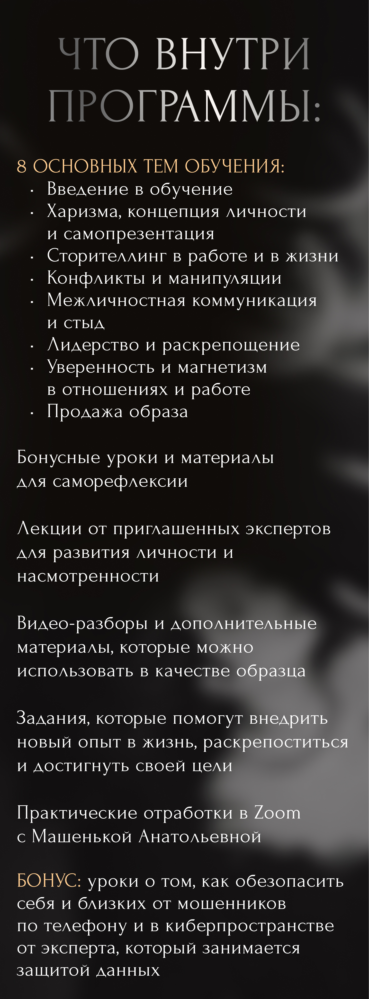 Ваш результат: уберёте страх делать и говорить о себе, выстроите режим работы и отдыха, соберёте вокруг себя людей, которые хотят за вами хотят идти, потому что вы – это вы.