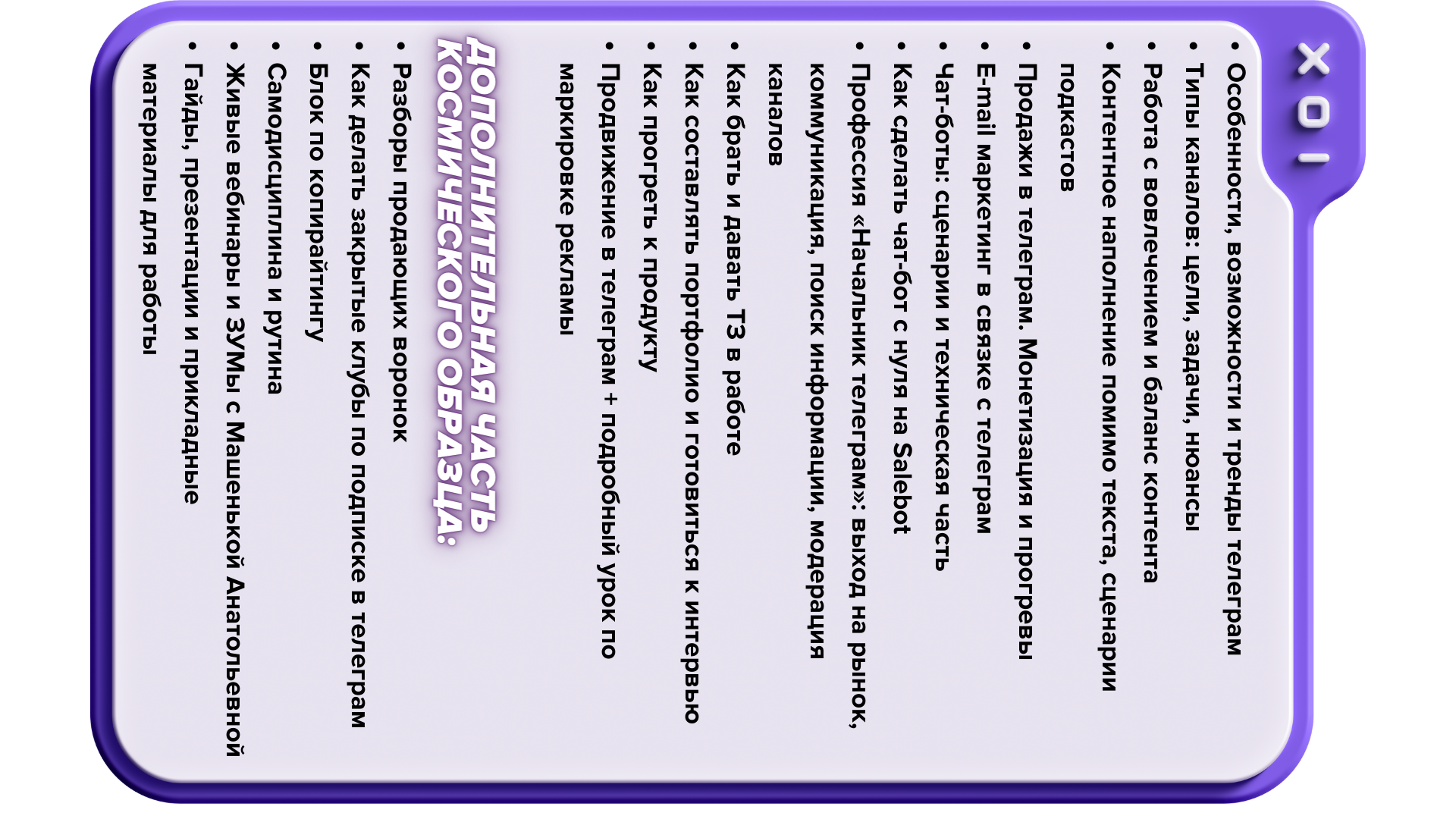 Вы получите приглашение в закрытый чат-бот, где будет вся информация по обучению, лучшие условия участия, а также разноформатный контент от Машеньки Анатольевны.